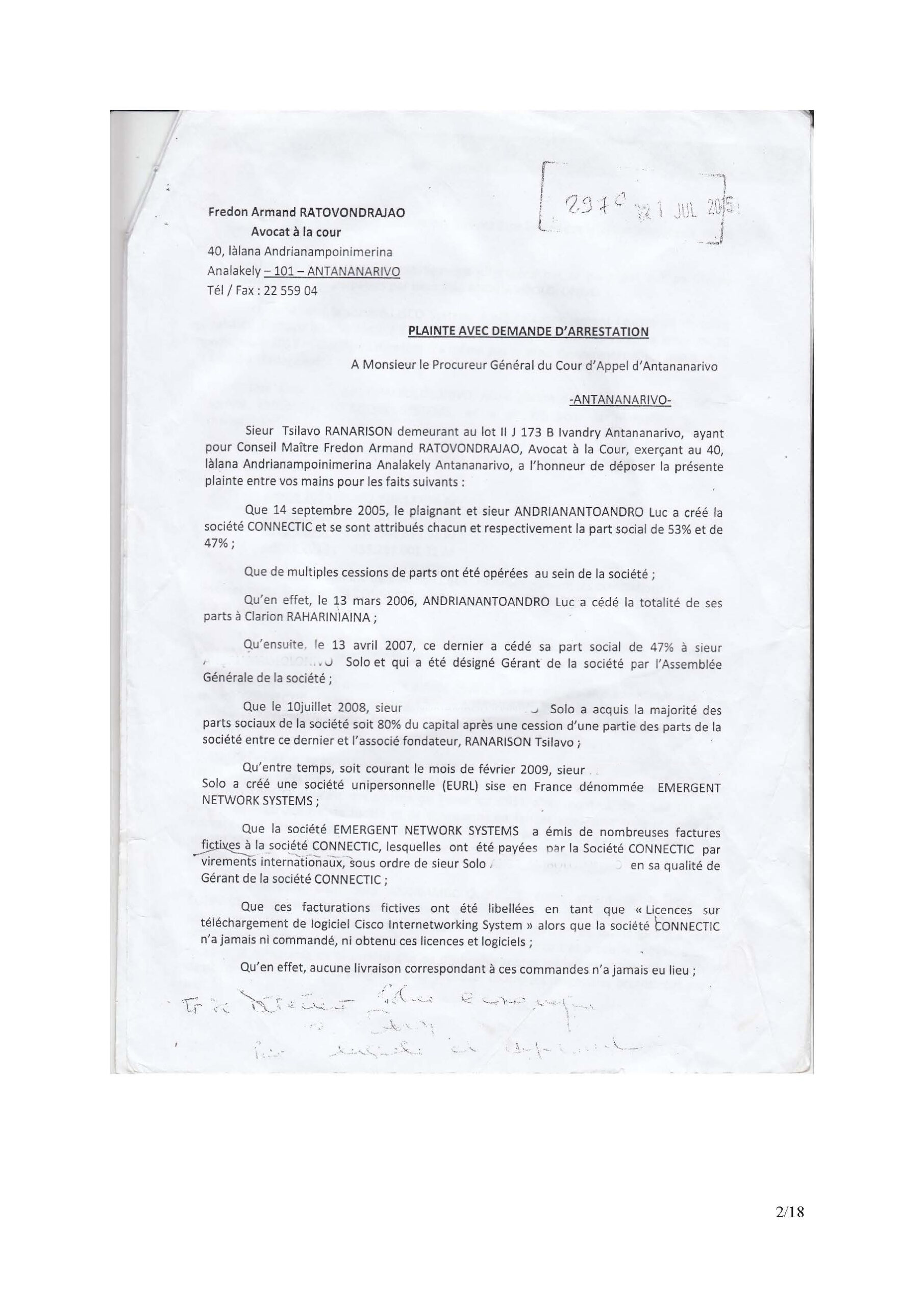 Le 20 juillet 2015, Monsieur RANARISON portait plainte, entre les mains de Monsieur le Procureur Général de la Cour d’appel d’ANTANANARIVO (MADAGASCAR), à l’encontre de Solo, pour fraude, détournement et recel de biens sociaux, escroquerie, faux et usage de faux